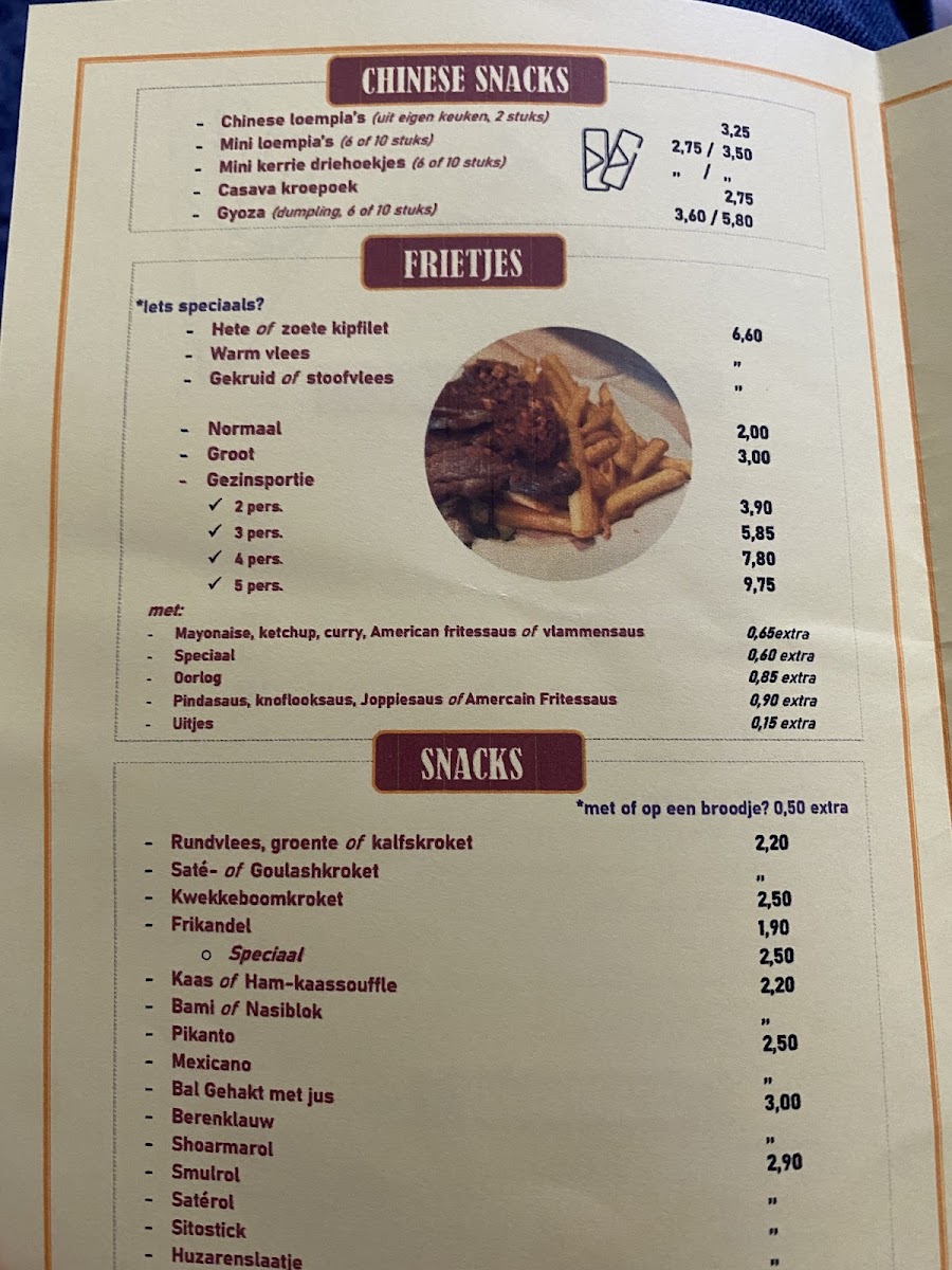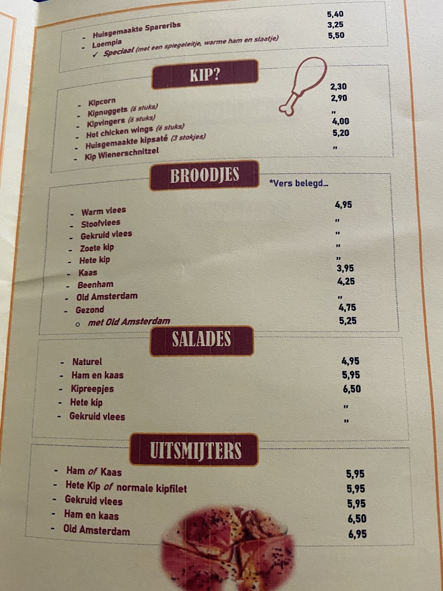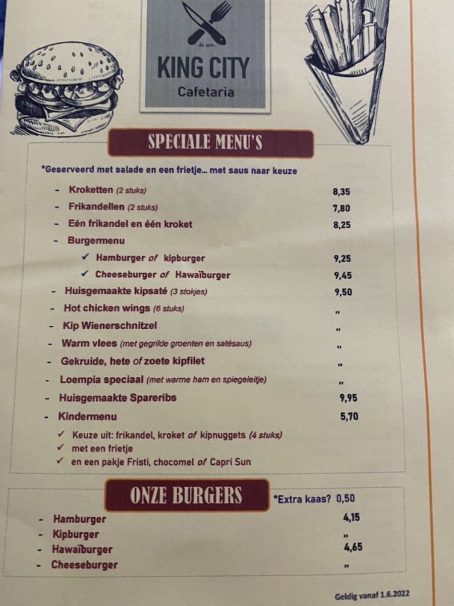 The menu at Cafetaria King City offers a relaxed selection of casual bites and comforting flavors, reflecting both local Dutch favorites and diverse international touches. Guests can find comforting options like Frikandel mit Pommes for a familiar snack, or savor something a bit different with dishes such as 廣式炒麵 and freshly made Chinese-style loempia’s. These choices make for a satisfying meal any time of day, whether it’s a quick lunch, an easy dinner, or a casual snack break.